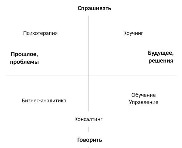 В чем же состоит отличие коучинга от смежных специальностей? Отличие коучинга от смежных специальностей иллюстрирует график, построенный с помощью 2-х линий, одна из которых это линии времени, вторая шкала профессиональной активности специалиста (рис.2). И если деятельность психотерапевтов, психологов, бизнес-аналитиков направлена на решение проблем в прошлом, то деятельность коуча состоит в построении такой формы взаимодействия с клиентом, когда из ситуации «сейчас» мы идем в ситуацию «завтра» через поиск и реализацию целей клиента путем постановки «сильных» вопросов [1].