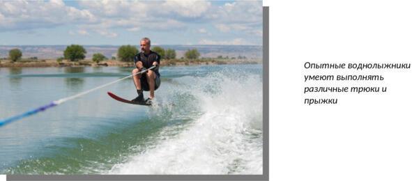 Катер, который буксирует лыжника, идет со скоростью 25 км/ч для начинающих и 3035 км/ч для мастеров.