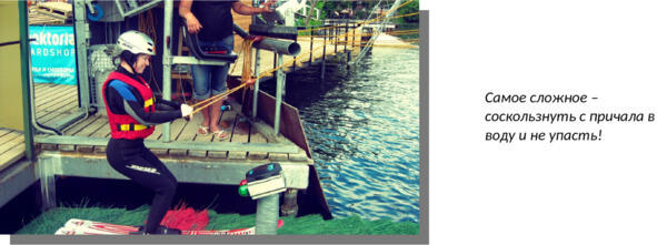 «Встать» на воду и тут же не упасть самая трудная задача! На ноги идет довольно большая нагрузка, при этом нельзя допустить, чтобы они дрожали или разъезжались в разные стороны. Трос слишком резко тянет вперед, и может случиться такое, что ноги не успеют «догнать» руки. И вы полетите в воду головой вперед. Важно удерживать равновесие и полностью контролировать вес своего тела.