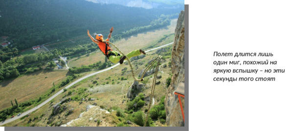 Свободное падение длится 24 секунды, в зависимости от высоты. Скорее всего, вы не успеете даже ничего понять. Только один короткий миг всепоглощающего ощущения полета и вот вы уже раскачиваетесь на веревке из стороны в сторону, как на качелях.