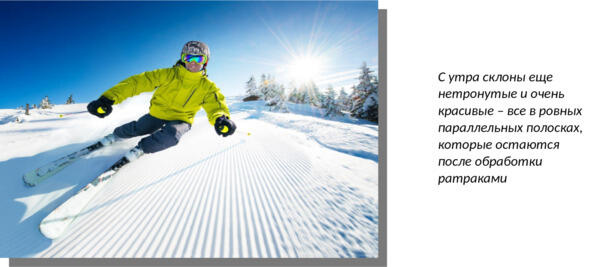 В некоторых местах нужно сначала подняться на вершину, чтобы съехать вниз. В некоторых наоборот сначала нужно съехать, а потом подняться обратно, чтобы съехать еще раз. И еще раз. Это затягивает. Ветер в лицо, скрип и брызги снега, ощущение легкости, скорость, скольжение Дух захватывает!