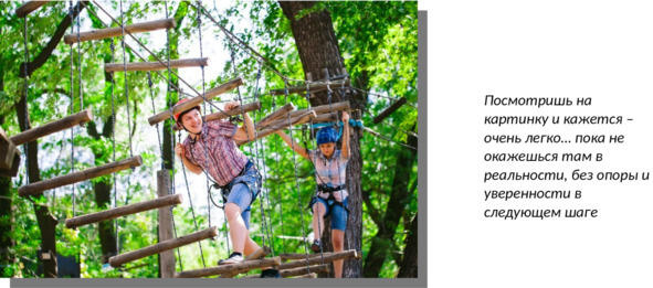 Вы приезжаете в веревочный «городок» куда-нибудь в прекрасный сосновый лес или городской парк. Проходите инструктаж по технике безопасности на детской учебной трассе. Вам показывают, как надевать обвязку, куда цеплять страховку, как пользоваться карабином А дальше сами.