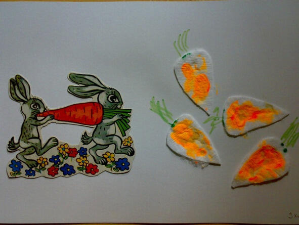 «Зайцы собирают морковь, пусть у них будет много моркови, сделаем ее вместе с тобой из ватных дисков».