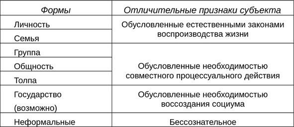 Таблица 1. Признаки классификации субъектов общественных отношений