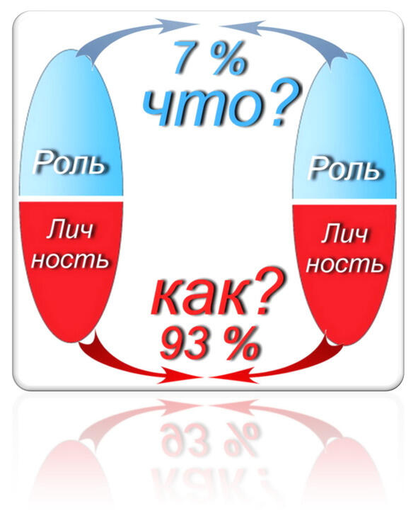 На протяжении дня мы выступаем в разных ролях. Мы и пациенты у врача, и пассажиры в общественном транспорте, специалисты и эксперты на работе, дома мы родители, покупатели в магазине и клиенты в банке. Исходя из нашей роли, мы формируем определённые цели. То есть, для разных ролей у нас разные цели. Но есть то, что мы поменять практически не можем. Во всяком случае, в среднесрочной и долгосрочной перспективе. Это «матрица» нашего поведения. Это «отпечатки пальцев» нашего стиля общения. Это то, что нас характеризует как личность, то, как нас воспринимают окружающие. Дело в том, что общение между людьми (в любом диалоге) всегда осуществляется в двух плоскостях. В плоскости «ролевой», и в плоскости «личностной». На «ролевом» уровне передаётся информация, которая отвечает на вопрос «Что происходит?» На «личностном» уровне информация отвечает на вопрос «Как это происходит?». Вы удивитесь процентному соотношению передаваемой информации. Если взять за 100% всю информацию, коей делятся люди, коммуницируя друг с другом, то информация на ролевом уровне, отвечающая на вопрос «что происходит?» или «что говорится?», составляет всего 7%. Это некий сухой остаток. Это «язык роботов» содержащий сухие цифры и чёткие факты. Это информация адресованная сознанию. А информация на уровне личности это та информация, что отвечает на вопрос«как это происходит?», «как передаётся информация?». И эта информация составляет 93% от всей информации передаваемой от человека человеку. Это поле деятельности наших эмоций, наше «нравится не нравится». Это то, что мы чувствуем и ощущаем в момент общения. Это информация адресованная подсознанию. Ещё в семидесятых годах прошлого столетия, об этом интересном соотношении передачи информации говорили социальный психолог Альберт Майерабиан, и Алан Пиз автор известной книги «Язык телодвижений». В связи с этим сразу возникают два вопроса: