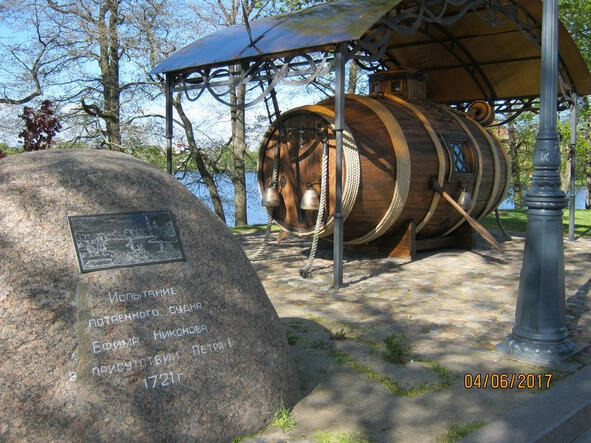 И ещё одним достойным событием памятен для Сестрорецка 1721 год! испытание на озере Сестрорецкий Разлив первого в мире прообраза подводной лодки: «потаённого судна», сконструированного и построенного крестьянином Ефимом Никоновым из досок, медных листов, железных обручей и кожи. Испытания проводились в присутствии самого Петра.