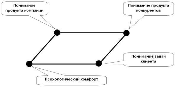 Компетенция Психологический комфорт. Твое умение налаживать партнерско-дружеские отношения с клиентом, сократить дистанцию в общении это очень полезная компетенция (см. рисунок 4). В FMCG и B2C продажах она является если не самой важной, то одной из ключевых. В сложных продажах В2В все несколько иначе. Тут она теряет свою основополагающую значимость и выполняет роль вспомогательной. Не то, чтобы она совсем не нужна, но выстроить деловые отношения с заказчиком только на ее основе получится не всегда.