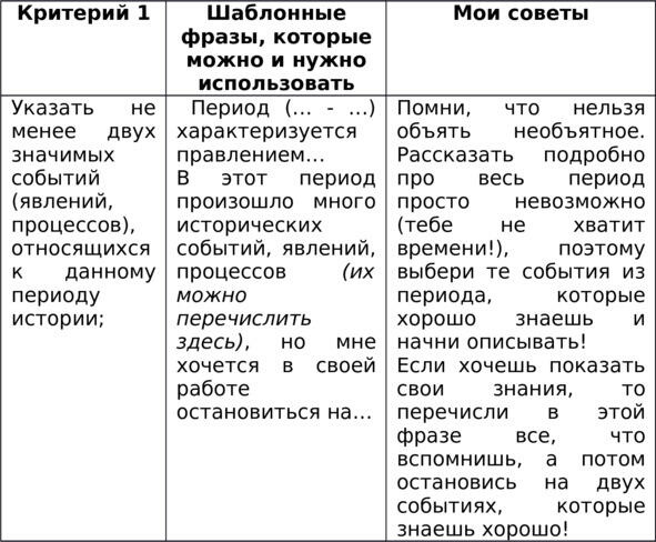 Таким образом, уже с помощью первых двух предложений, взятых из шаблона, мы с тобой, во-первых, быстро начали свое сочинение, а во-вторых, уже выполнили первый критерий, который будут оценивать эксперты! Можешь проверить по таблице. Проверяй и переходи к следующей главе.