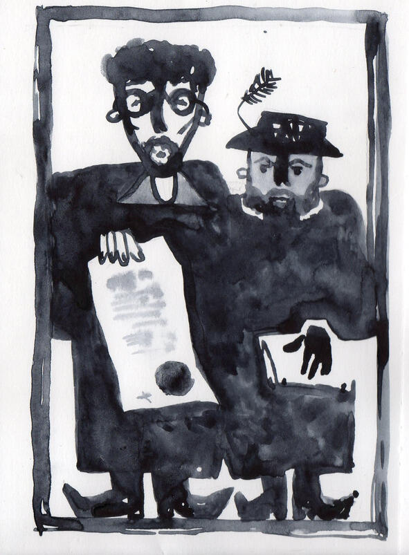На следующий день в дом к Маленьким Штанишкам опять постучали. Мама открыла дверь и увидела на пороге двух человек. Один был очень хорошо одет и смотрел сквозь очки надменным взглядом. Второй же стоял чуть позади и держал в руках большой портфель.