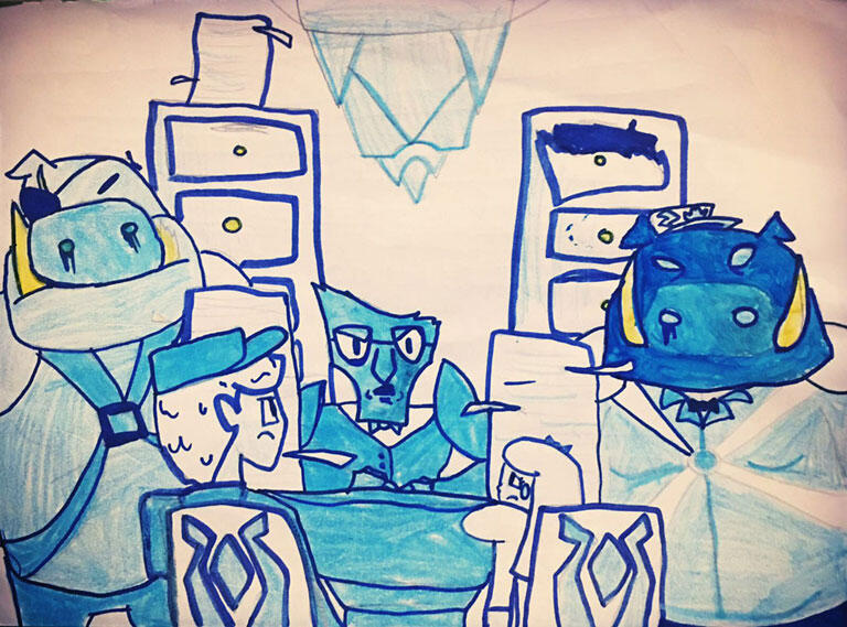 Один из кабанов что-то шепнул волку, выглядевшему постарше, и стражники освободили им проход, убрав алебарды от дверей. Те распахнулись, открыв Саше и Ане вид на почти точную копию той самой комнаты с письменным столом и шкафом, в которой они оказались вчера. Только эта была в несколько раз больше. Стоя перед открытыми дверями, Саша пробормотал: