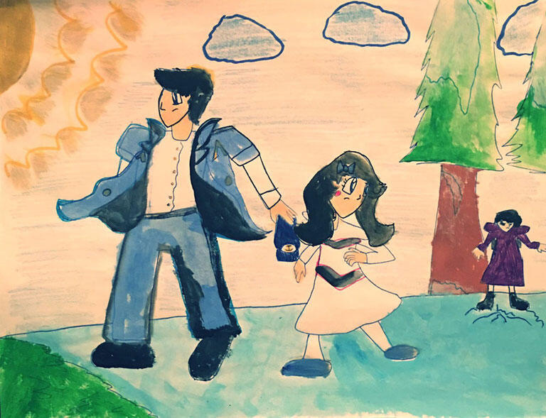 А птица поднималась всё выше. Надо было что-то делать Тогда дети, не сговариваясь, стали громко кричать и махать руками, надеясь, что птица, испугавшись их криков, выпустит Лиззи из своих лап. Но та, не выпуская ребёнка, подняла голову, увенчанную короной золотисто-жёлтых перьев, и посмотрела на ребят. И Саше с Аней показалось, что птица улыбнулась. Они тоже смотрели на неё и не знали, что дальше делать. Трудно было поверить, что такая красивая птица унесёт их подругу. Но с другой стороны Лиззи была в её когтях.