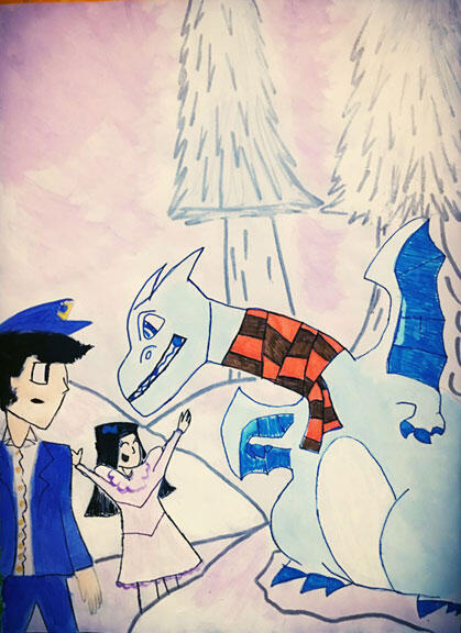 Наконец из-под розовой толщи снега показалась когтистая лапа. За ней ещё одна. А потом Аня и Саша смогли хорошенько разглядеть то, что они приняли за краник это оказалась голова самого обыкновенного дракона. Не особенно длинная шея была замотана чем-то вроде шарфа со свисающими концами. А на спине топорщились два небольших крылышка.