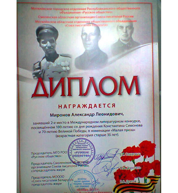 За участие в Лит. Кокурсе «Герои Великой Победы» Диплом и медаль «Никто не забыт!