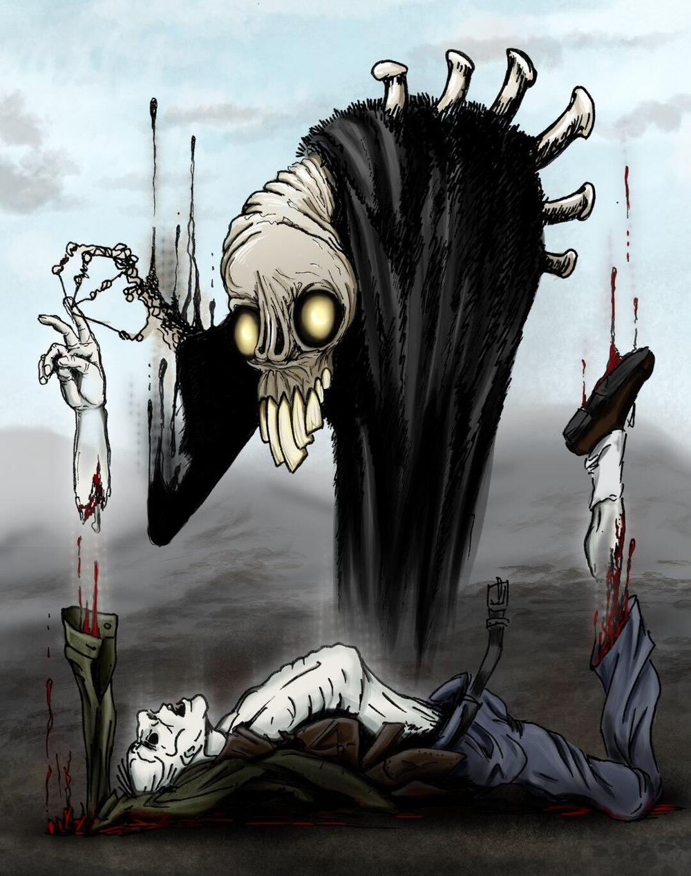 Сутулая долговязая фигура ходила меж трупов, ловила тонкими руками вздымающиеся к небу обломки тел и отправляла их в наплечную суму из коричневой кожи. В такие моменты собиратель казался странной птицей, что расправила одно крыло. На его бледном лице, больше походившем на череп, обтянутый тонкой кожей, можно было различить детское любопытство каждый раз, когда он наклонялся, отламывал от разлагающихся тел небольшие куски, обнюхивал и осматривал их со всех сторон. Когда собиратель подходил к очередному трупу, от того врассыпную разбегались падальщики. При этом они недовольно присвистывали, а их тела дрожали крупной дрожью. После того, как собиратель удалялся, падальщики возвращались к своей добыче, накрывали тело и с шелестом впивались в испаряющиеся останки.