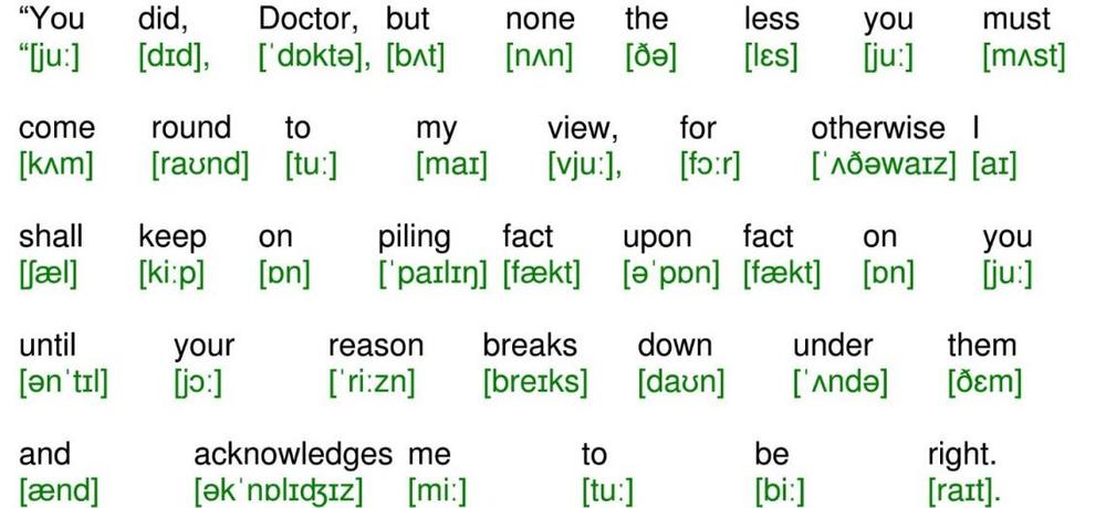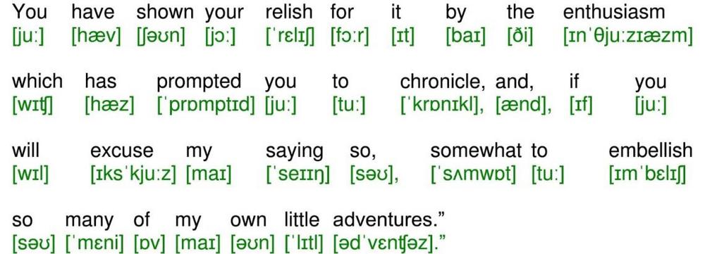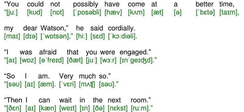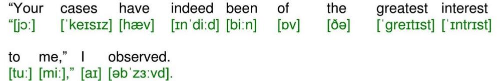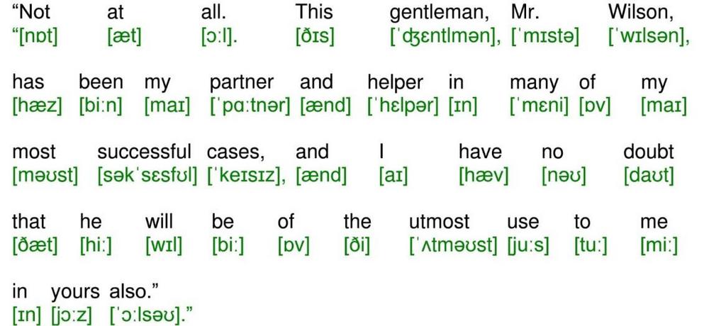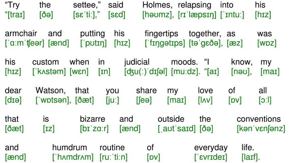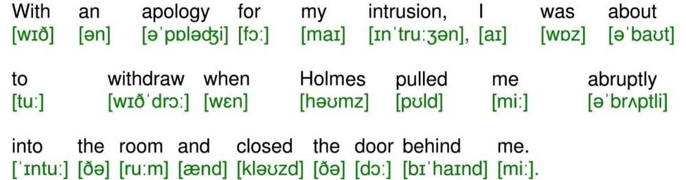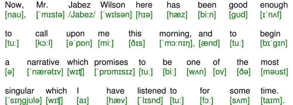 Для подготовки видеоролика использована бесплатная аудиокнига с публичного сайта Librivox (https://librivox.org/the-adventures-of-sherlock-holmes-version-4-by-sir-arthur-conan-doyle/), озвученная носителем языка (David Clarke), и бесплатная электронная книга с публичного сайта Project Gutenberg (http://www.gutenberg.org/ebooks/1661). Транскрипция, записанная символами международного фонетического алфавита, выполнена с помощью онлайн-переводчика английского текста в транскрипцию. Автор онлайн-переводчика Дмитрий Янс (https://tophonetics.com/ru/).