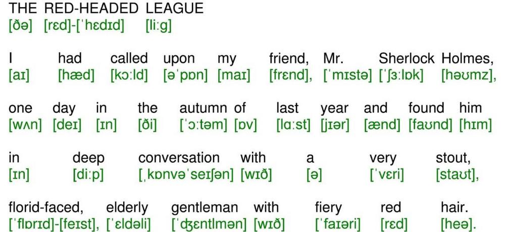 В данной книге приводится текст рассказа А. К. Дойла «Союз Рыжих» на английском языке с транскрипцией. Текст рассказа разбит на небольшие фрагменты. Для каждого фрагмента подготовлена транскрипция, оформленная в виде иллюстрации с изображением транскрипции текста фрагмента. Фрагменты пронумерованы порядковыми номерами (001, 002,,257). Для каждого фрагмента создан видеоролик презентация данного фрагмента. Адрес видеоролика приведён после номера фрагмента. Имя видеоролика совпадает с номером фрагмента.