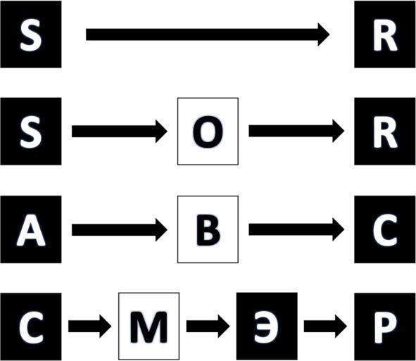 Таким образом, ключевой переменной, под углом зрения основателей, представителей и последователей когнитивно-поведенческой психотерапии, является мышление, обуславливающее эмоциональные, телесные и поведенческие реакции человека. Иными словами, реакции возникают не из-за непосредственного воздействия стимула, как считалось раньше (S R). Между стимулом и реакциями важную роль играет организм (S O R), а именно отношение человека к тому или иному активирующему событию (A activating event) в виде его мыслей и убеждений (B beliefs), создающих эмоциональные, телесные и поведенческие последствия (С consequences). В русскоязычном пространстве формула A-B-C описывается с помощью аббревиатуры СМЭР, расшифровывающейся следующим образом: событие мысли эмоции реакции (телесные и поведенческие) (см. рис. 3).