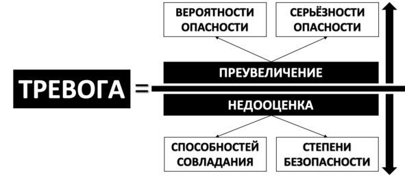 Таким образом, во время эпизодов тревоги человек избыточно концентрируется на мыслях об опасности и своей неспособности справиться с тревожащей ситуацией, что приводит к невозможности более трезвого рассмотрения менее угрожающих вариантов развития событий, поскольку в моменты выраженной тревоги довольно сложно мыслить рационально. Иными словами, человек начинает тревожиться, когда риски трактуются как высокие, а он не осознаёт, за счёт чего и как можно с ними совладать (см. рис. 9).