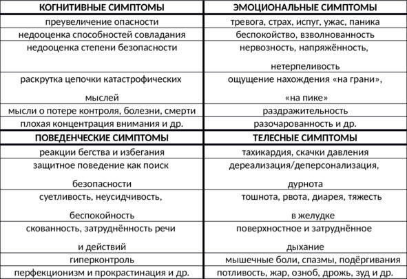 Основные симптомы тревоги, сгруппированные по принципу их принадлежности к когнитивной, эмоциональной, телесной и поведенческой сферам, в наглядном и доступном виде представлены в нижеприведённой таблице (см. таб. 4).