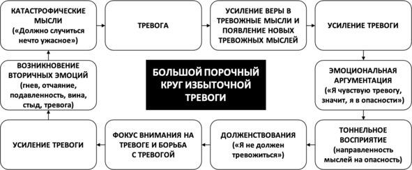 Важно понимать, что борьба с различными проявлениями тревоги бесполезна, ведь попытка устранить пугающие следствия тревоги (панические атаки, навязчивости и т.д.) ведёт лишь к их усилению. Действительно, боясь своих неприятных ощущений, вы начинаете сильнее тревожиться и напрягаться, из-за чего эти симптомы усиливаются так образуется порочный круг избыточной тревоги (см. рис. 12). Мысль о том, что вам нужно избавиться от тревоги, привносит в жизнь больше проблем, чем сама тревога, поэтому помните, что тревога нормальная часть жизни человека.