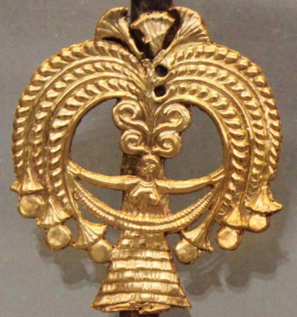 В Афинском музее имеется золотое украшение 16 в. до. н.э. со схожим сюжетом. Как видно на фото, богиня порождает все силой своего разума. На фото снизу также капители колонн с акантом и пальметтой. Это были священные знаки. В случае применения дорического ордера, акант рисовали на фризе.