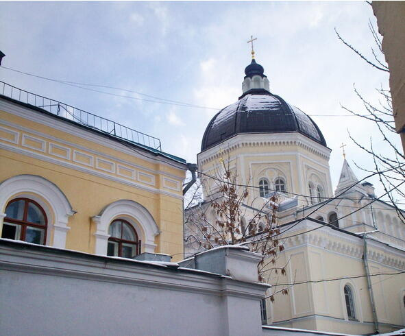 Вообще, этот район между Солянкой, Маросейкой и бульварами для меня один из самых неожиданных и самых любимых в Москве. Я никогда не могу понять, каким образом, блуждая по небольшому, в сущности, пространству, вроде бы исхоженному вдоль и поперек, каждый раз натыкаешься на совершенно незнакомые места и не можешь выйти к знакомым. Здесь пространство трехмерно (ибо важную часть его занимают горки), но иногда кажется пятимерным уж очень много в нем спряталось. Время играет в сложные игры с пространством. Здесь чуть ли не самые старые дома в Москве, а в трущобах трех-или четырехвековой давности идет новая и уже непонятная нам жизнь. Поэтому предложенный маршрут в этом месте лишь один из многих возможных вариантов. Он идет по Старосадскому переулку (по имени которого и назван храм Владимира) ради красивой и неожиданной лютеранской церкви.