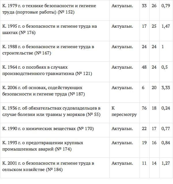 С учетом сказанного, сводная таблица ратификации неприоритетных конвенций МОТ выглядит следующим образом: