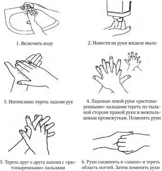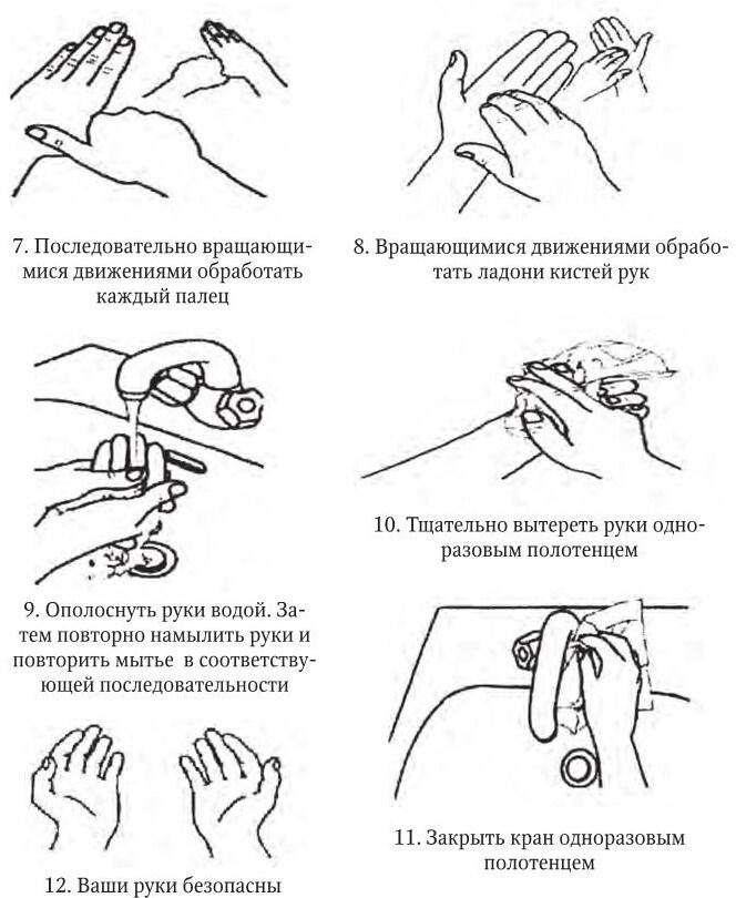 В 1843 г. Оливер Холмс впервые пришел к выводу, что врачи и средний медперсонал заражают своих пациентов «лихорадкой» через немытые руки, а в 1847 г. Игнац Земмельвейс провел одно из первых в истории эпидемиологии аналитическое эпидемиологическое исследование и убедительно доказал, что очищение рук медицинского персонала является важнейшей процедурой, позволяющей предупредить возникновение ВБИ. Именно открытия Земмельвейса положили начало современным представлениям о мерах профилактики инфекций в области хирургического вмешательства (ИОХВ). Выделяют три уровня деконтаминации рук: социальный, гигиенический и хирургический. Социальный уровень мытья рук используется в обиходе. Хирургический в хирургии (перед операциями). Гигиеническая обработка рук используется медицинскими работниками с целью обеспечения инфекционной безопасности пациента и медперсонала. Мытье рук осуществляется в определенном порядке, указанном на рис. 19, с двукратным намыливанием. Продолжительность каждого действия не менее 10 с.