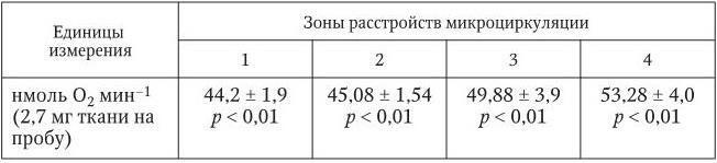 Для оценки влияния огнестрельного ранения на окислительный энергетический обмен в зонах поражения в гомогенатах мышц полярографическим методом исследовали активность цитохромоксидазы (ЦХО) конечного фермента дыхательной цепи митохондрий. Через 6 ч после нанесения ранения активность ЦХО была снижена во всех зонах в среднем на 30 %, а в интактной конечности на 40 %. На третьи сутки после ранения установлено значительное уменьшение активности ЦХО во всех зонах, но особенно в зоне некроза, где она составила в среднем 60 % (табл. 2). В интактной конечности активность ЦХО составила 87 % по отношению к контрольной группе.