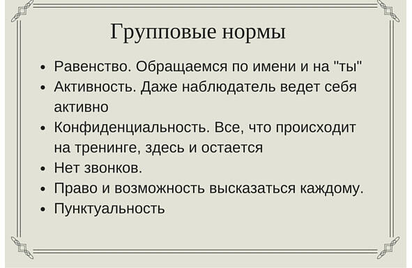 Существуют базовые групповые нормы, которых стоит придерживаться в любом тренинге. Среди них:
