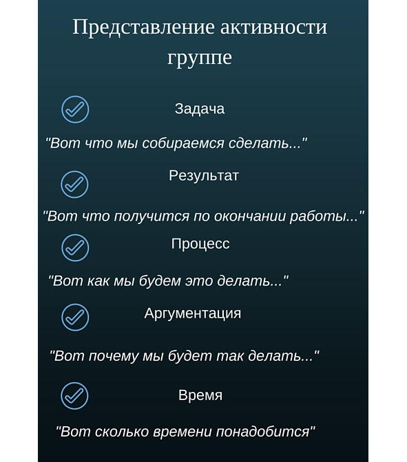 Норма активности. Каждый имеет право активное участие. Если в какой-то момент захочется посмотреть на процесс со стороны, можно взять на себя роль наблюдателя. Но наблюдатель тоже ведет себя активно. И может давать обратную связь участникам.