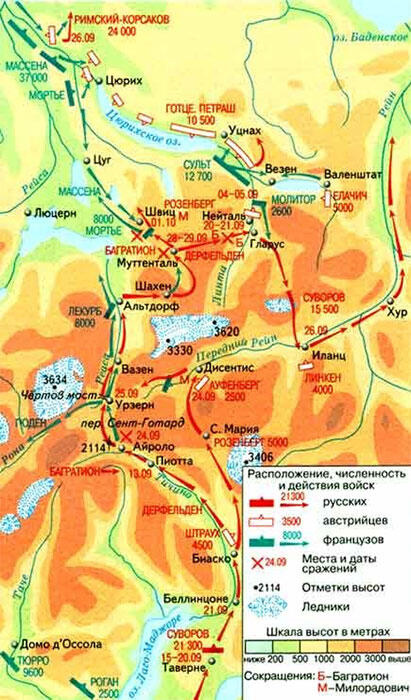На этом фоне чуть ли не единственной хорошей новостью становится приказ российского императора от 7 сентября, в котором нашему фельдмаршалу предписывается «соединить в Швейцарии Мои войска и действовать оттуда куда и как заблагорассудите, независимо от Це́сарцев [то есть австрийцев] // Но как скоро достоверно вы бы узнали //, что Венский Двор приступает к заключению с Францией // мира //, тогда // изберите одно из двух //: или оставшись в Швейцарии, продолжать // войну самим собою, или приняв нужные меры, обратиться с армией вашей к России[62]»[63]. По крайней мере, отныне наш военачальник может вести боевые действия, полагаясь лишь на свой собственный опыт.