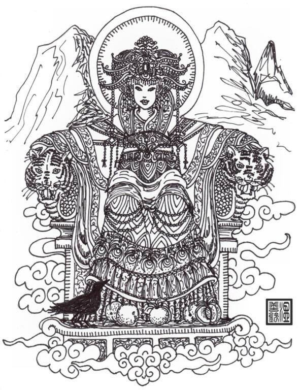 Однако позже Си- Ван-Му предстает как прекрасное воплощение женского начала, обладательница снадобья бессмертия, правительница западного рая бессмертных в горах Куньлунь. Ван означает царица в этом имени. Китайские императоры носили титул ВАН. Си- Ван-Му изображалась красивой женщиной в придворном одеянии, иногда верхом на журавле или тигре. Она обитала в девятиэтажном дворце из жадеита, окруженном золотой стеной более двух тысяч километров длиной. Бессмертные мужчины жили в правом крыле ее дворца, женщины в левом. В саду богини росли персики бессмертия. Дерево плодоносило один раз в 3000 лет. Когда персики созревали, Си Ван-му приглашала всех бессмертных и они лакомились чудесными плодами. Считалось, что благодетельная богиня дарила персики бессмертия некоторым правителям Древнего Китая. Си Ван-му известна как супруга Югуана, повелителя востока. Существует предание, что она встречалась с ним один раз в год на крыле гигантской птицы, что символизирует союз инь и ян. У скифов Си-Ван Му соответствовала Анахита, у венедов- Ванадис, и это божество, как Анат, известно на переднем Востоке с начала 2 тыс. до н. э. Одна из самых почитаемых богинь Поднебесной. Согласно давнему приданию, она пришла на землю людей из Страны Мертвых, но при этом, сохранила свои силы. Ван-означает царица, правительница. Демокрит именует Аполлона лишь ванаксом, царем. Си-ван-му оберегала человеческий род, даруя его лучшим представителям бессмертие. Она жрица справедливости. Когда люди погрязли в грехе, именно Си-ван-му наслала на них пандемию чумы. Также она в ответе за множественные погодные бедствия. Как видно, на переносице изображение тилаки, более напоминающее трехчастное, то есть Урдхва-Пундру. Как видно, Си-Ван -Му тождественна Кибеле.