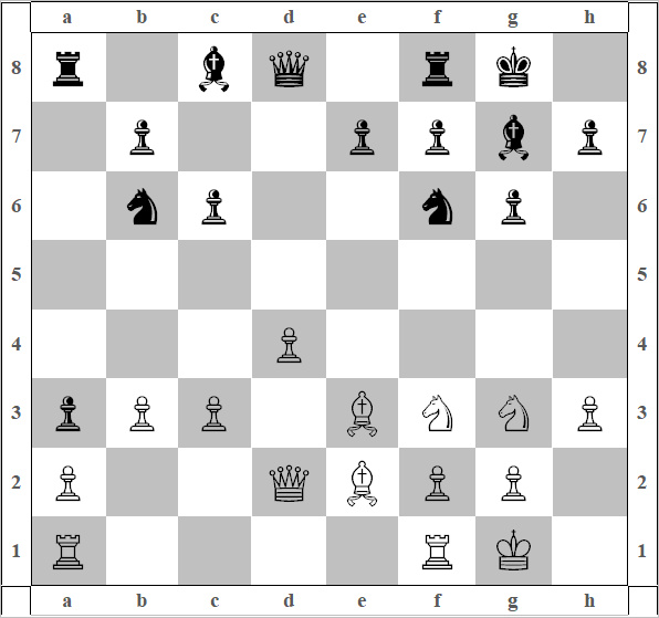 4) K:e4 Kf6, 5) Kg3 Kbd7, 6) Kf3 g6, 7) Ce2 Cg7, 8) 00 00, 9) c3 Kb6, 10) h3 a5, 11) Ce3 a4, 12) Фd2. НЕ очень понятно желание Белых игнорировать пешку a Черных. Присмотреться к ней стоило бы, потому что пешка проходит дальше. 12) а3 и позиция на диаграмме 22. Выбора между хорошим и плохим продолжением нет, любое продолжение у белых имеет свои минусы. Белые выбирают 13) b3.