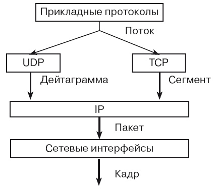 Следует отметить, что в рамках стека протоколов TCP/IP любая сеть, входящая в составную сеть, рассматривается как средство транспортировки пакетов данных между двумя соседними сетями. Каждый протокол оперирует определенной единицей передаваемых данных, названия которых, как правило, закрепляются в существующих стандартах (см. рис. 1).