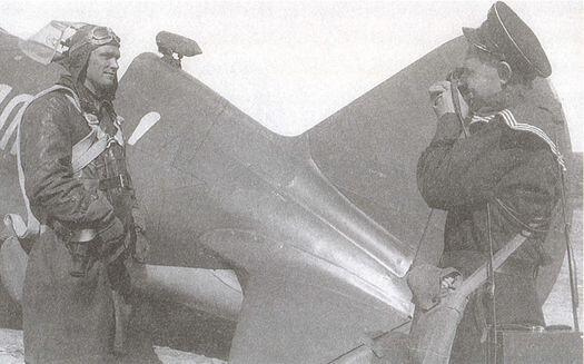 Летчик-истребитель Борис Сафонов и фотокорреспондент Евгений Халдей на аэродроме Ваенга. Снимок на фоне самолета старшего лейтенанта Александра Коваленко И-16 тип 24, бортовой номер 11 «За Сталина!», серийный номер 24Р21891. Сверху на фюзеляже за кабиной установлен фотопулемет ПАУ-22, что в то время встречалось не часто. Этот снимок интересен еще и тем, что через пару минут случится налет немецких самолетов на аэродром, и пулеметная очередь ляжет буквально в нескольких шагах от фотографа. 6 июля 1941 г.