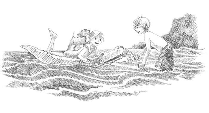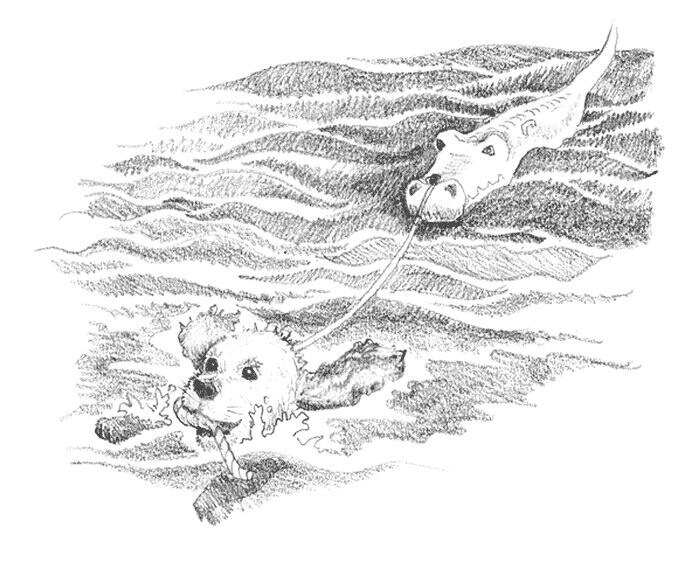 Но всё обошлось. Крокодил приближался к ним медленно, но верно: Любимчик тащил его за собой, ухватившись за верёвку зубами.