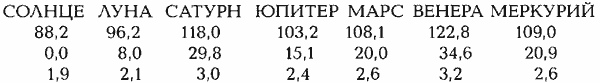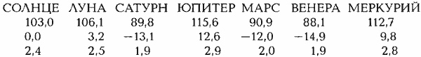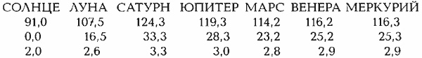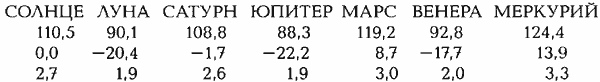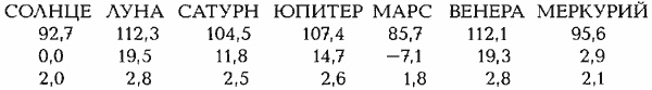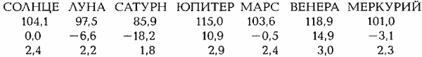 Как обычно, В ПЕРВОЙ СТРОКЕ каждой из нижеследующих таблиц мы даем эклиптикальную долготу планет в градусах, ВО ВТОРОЙ отклонение планет от Солнца по долготе в градусах по эклиптике J2000, В ТРЕТЬЕЙ положение планет по шкале созвездий, см. выше, а так же раздел 5.10 [НХЕ].