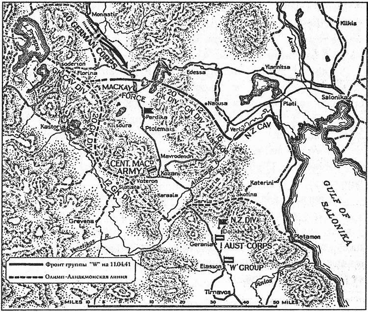 Несмотря на происходящие события, генерал Уилсон не предпринял никаких усилий для укрепления своего левого фланга. Более того, считая свои силы недостаточными для обороны сразу с двух направлений, командующий Центрально-Македонской армией генерал Уилсон отдал приказ: в ночь с 11 на 12 апреля начать отвод своих основных сил на юг, прикрываясь греческими арьергардами (на чем особо акцентирует внимание Типпельскирх). В результате нанесенный немцами 11 апреля удар почти не встретил сопротивления[134]. В этот день части лейбштандарта (моторизованной бригады СС) «Адольф Гитлер» заняли город Веви. Утром 12 апреля немецкий отряд численностью около 1500 человек при поддержке легких пехотных гаубиц, взвода 88-мм зениток и нескольких «штурмгешютцев» (появление которых в горах было для англичан полной неожиданностью) атаковал и после тяжелого боя захватил перевал Клиди. Перевал оборонял английский заслон так называемая группа Маккея, три неполных батальона и противотанковый дивизион численностью около 2000 человек. Только передовая 1-я рота лейбштандарта под командованием оберштурмфюрера Герда Пляйса взяла в этот день около сотни английских пленных. Всего британцы потеряли 37 человек убитыми, около 480 попали в плен. Потери немцев 37 человек убитыми, 95 ранеными и двое пленными. В плен в том числе попал командир 88-мм батареи гауптштурмфюрер Фендт, освобожденный лишь на следующий день. Тем не менее генерал Уилсон гордо заявил, что этот бой «остановил немецкий блицкриг в долине Флорины».