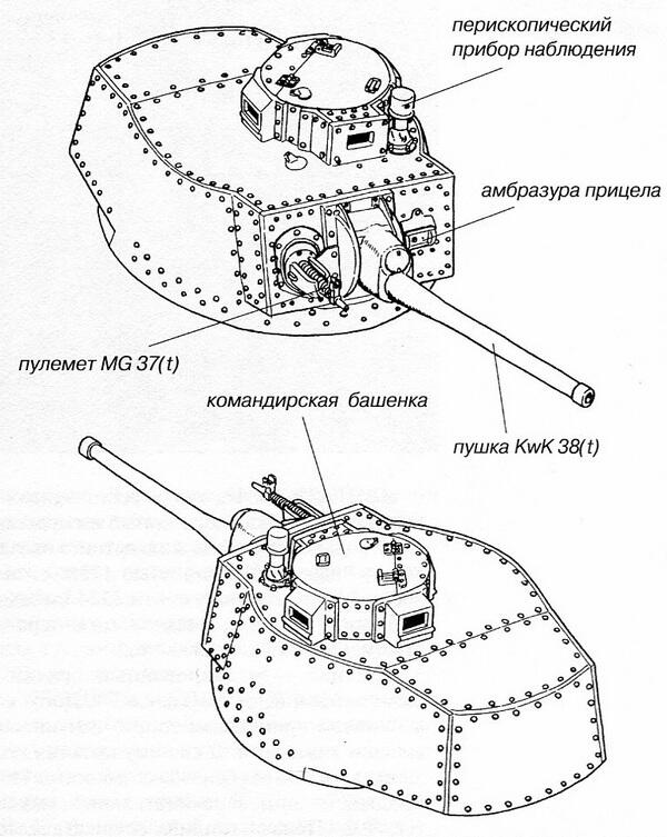 ВООРУЖЕНИЕ. На танке устанавливалась 37-мм пушка UV vz.38 (заводское обозначение фирмы Škoda А7, обозначение в Вермахте KwK (t) L/47,8) с длиной ствола 50 калибров (1858 мм). Орудие оснащалось полуавтоматическим клиновым затвором, обеспечивавшим скорострельность до 15 выстр./мин. Угол возвышения составлял +25°, склонения -10°. Масса орудия 275 кг.