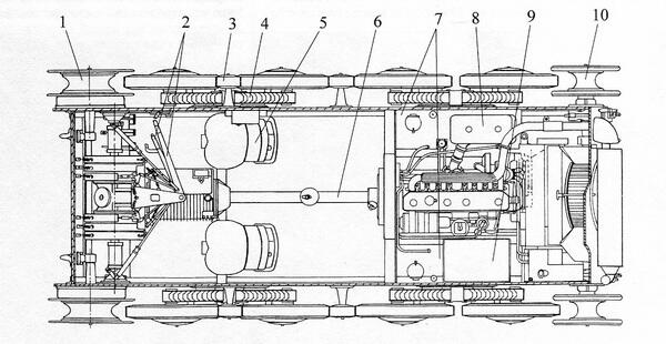 1 ведущее колесо; 2 рычаги управления; 3 поддерживающий каток; 4 рессора; 5 сиденье механика-водителя; 6 карданный вал; 7 топливные баки; 8 воздушный фильтр; 9 аккумулятор; 10 направляющее колесо.