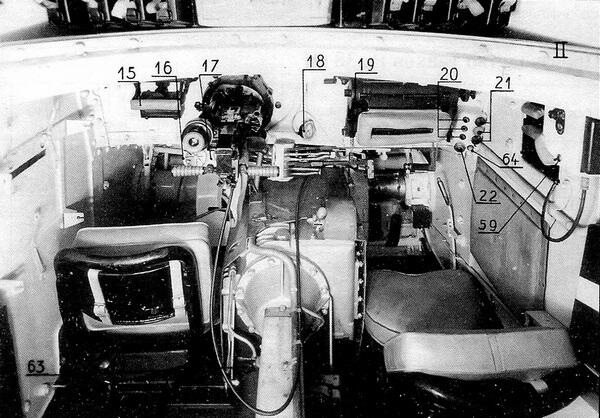 Отделение управления танка LT vz.38. Справа место механика-водителя, слева стрелка-радиста.