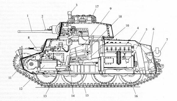 1 37-мм пушка; 2 7,92-мм пулемет ZB vz.37; 3 перископический прибор наблюдения; 4 двигатель; 5 радиатор; 6 вентилятор; 7 глушитель; 8 курсовой пулемет ZB vz.37; 9 ящик с 37-мм выстрелами; 10 огнетушитель; 11 буксирный крюк; 12 коробка передач; 13 сиденье стрелка-радиста; 14 тележка подвески; 15 коробки с пулеметными патронами; 16 опорный каток; 17 командирская башенка; 18 сиденье наводчика.