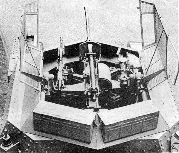Вид на боевое отделение разведывательного танка Aufklärungspanzer 38 (t). Хорошо виден лафет вооружения с 20-мм пушкой KwK 38 в центре, пулеметом MG 34 слева и прицелом TZF 3а справа. Откидная сетчатая крыша защищала боевое отделение от ручных гранат.