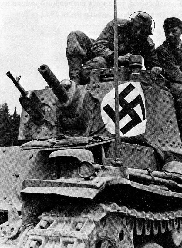 Командирский танк Pz.Bf.Wg.38 (t) звена «рота батальон». Лето 1941 года. Ствол орудия, по-видимому, отбит попаданием снаряда. Растянутый на броне флаг со свастикой, облегчал опознавание машин немецкой авиацией.
