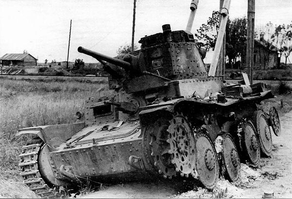 Pz.38 (t) Ausf.A (либо Ausf.В ранних выпусков), подбитый советскими войсками в Белоруссии, 1941 год. Эту машину отличают антенный ввод чехословацкого типа и амбразура прицела раннего образца с одним отверстием.