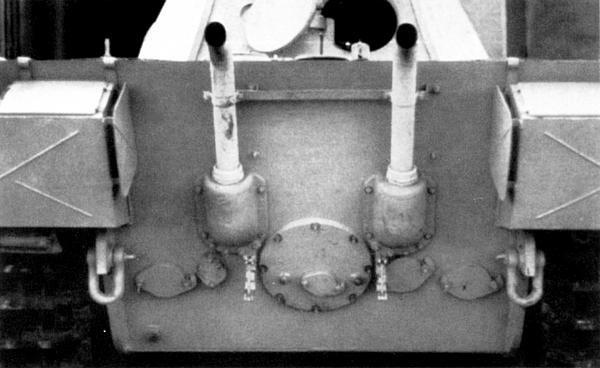 Кормовая часть «Пантеры» Ausf.D, изготовленной компанией MAN в мае 1943 года. Хорошо видны крепления для укладки домкрата (внизу под бронировкой выхлопных труб), а также дополнительные тепловые экраны на ящиках ЗИП (ЯМ).