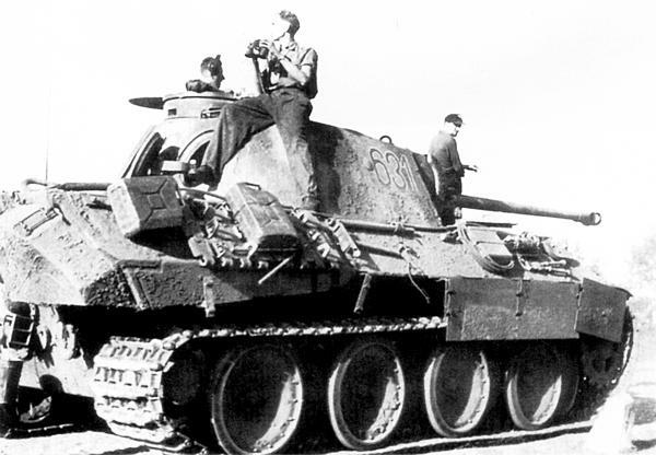 Танк «Пантера» Ausf.D, подбитый и захваченный частями Красной Армии в боях на Курской дуге. Июль 1943 года. Хорошо видны дополнительные ящики для ЗИПа, закреплённые на крыше моторного отделения, а также броневой стакан для крепления воздухопитающей трубы при преодолении по дну водных преград (ЦАМО).