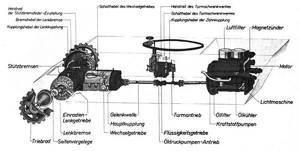 Схема приводов от двигателя к ведущим колёсам и механизму поворота башни (из немецкого документа).