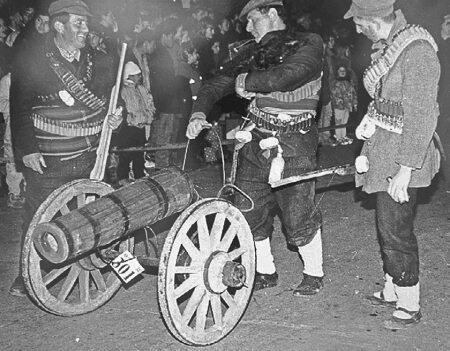 Рис. 1.36. Деревянная пушка начала XX века. Фотография праздника, посвященного войне Македонии с Турцией в начале XX века. Для войны македонцы изготовили несколько деревянных пушек из черешневого дерева. Одна из них до сих пор хранится в музее и используется на праздниках. Данная фотография была выставлена в Археологическом музее в Струмице, в Македонии, осенью 2005 года, где мы ее перефотографировали.